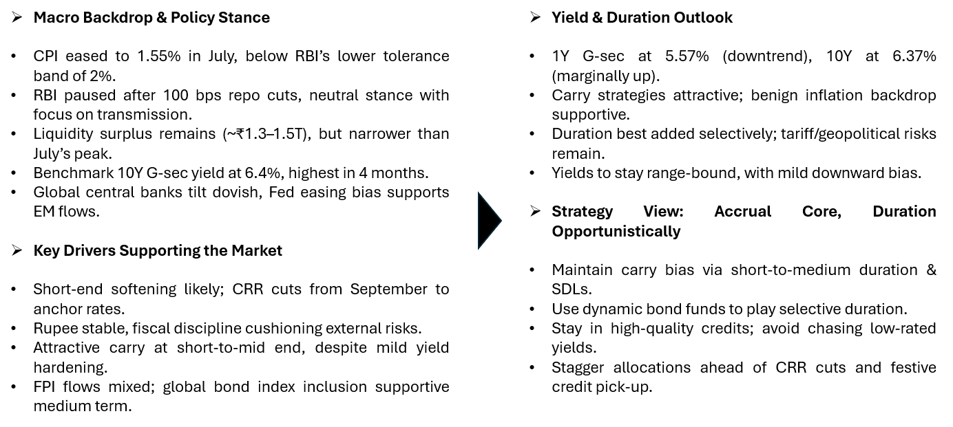 | Debt | Positive | A barbell approach is prudent — blending select long-duration exposure with 2–3-year high-quality accrual strategies. |
